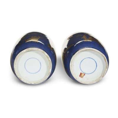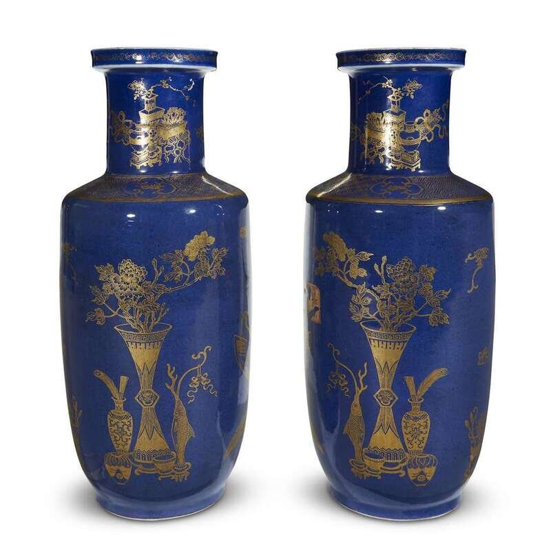A pair of Chinese gilt-decorated bleu souffle-glazed porcelain rouleau vases late 19th century