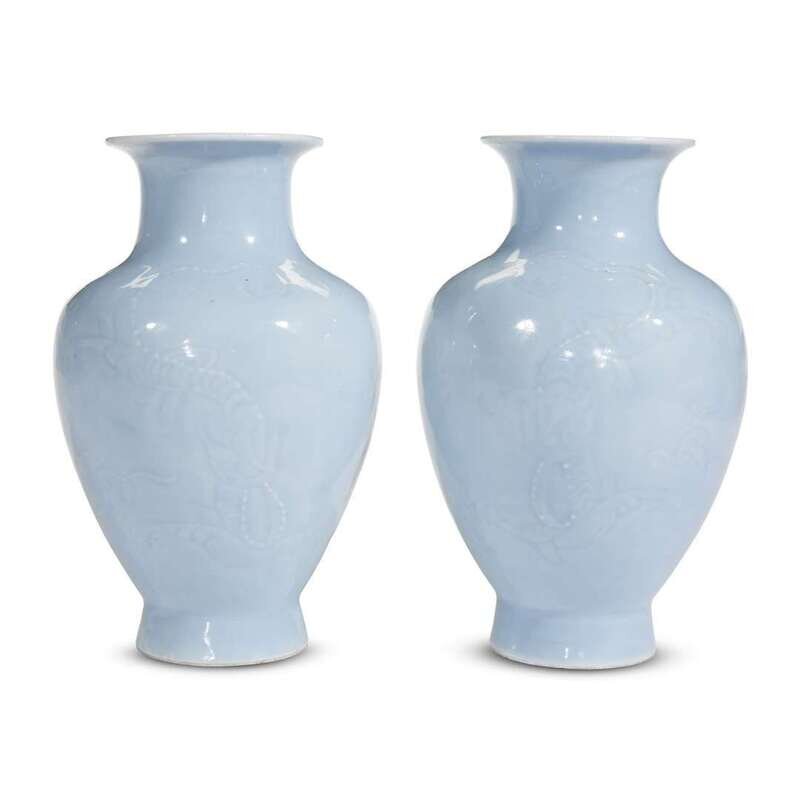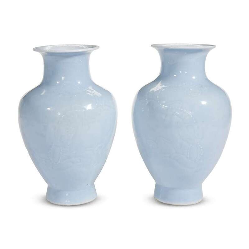 A pair of Chinese "clair de lune"- glazed porcelain vases molded with qilong six character qianlong seal mark