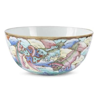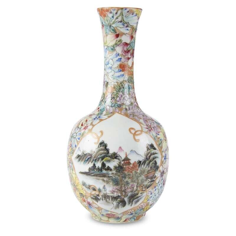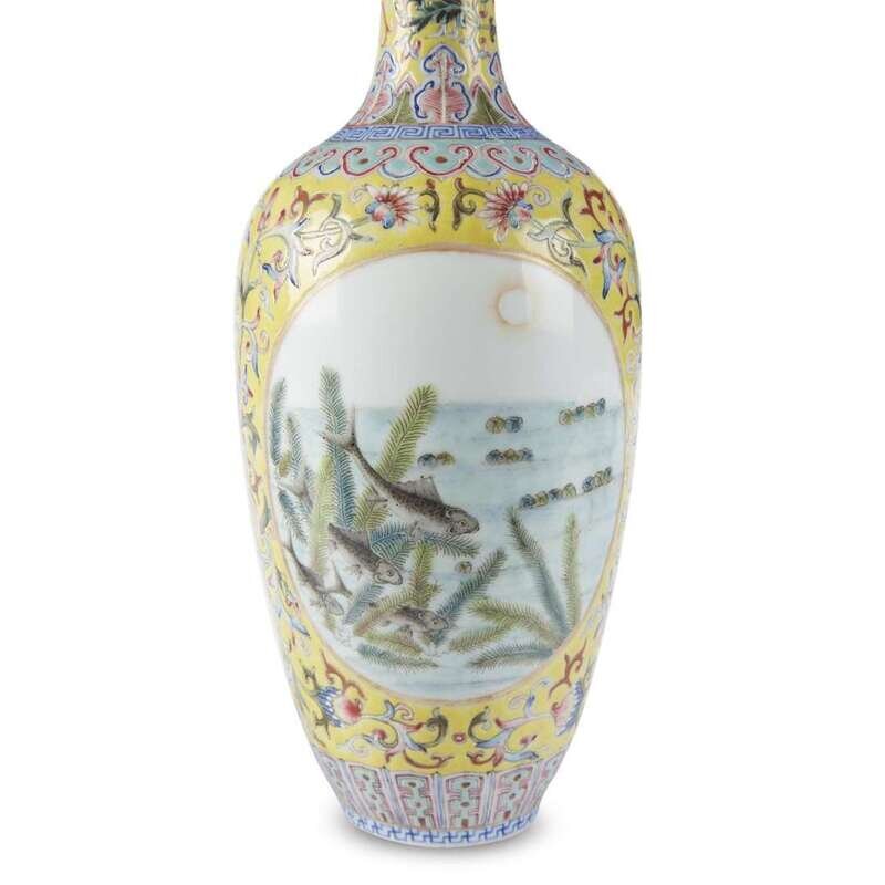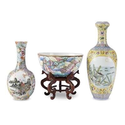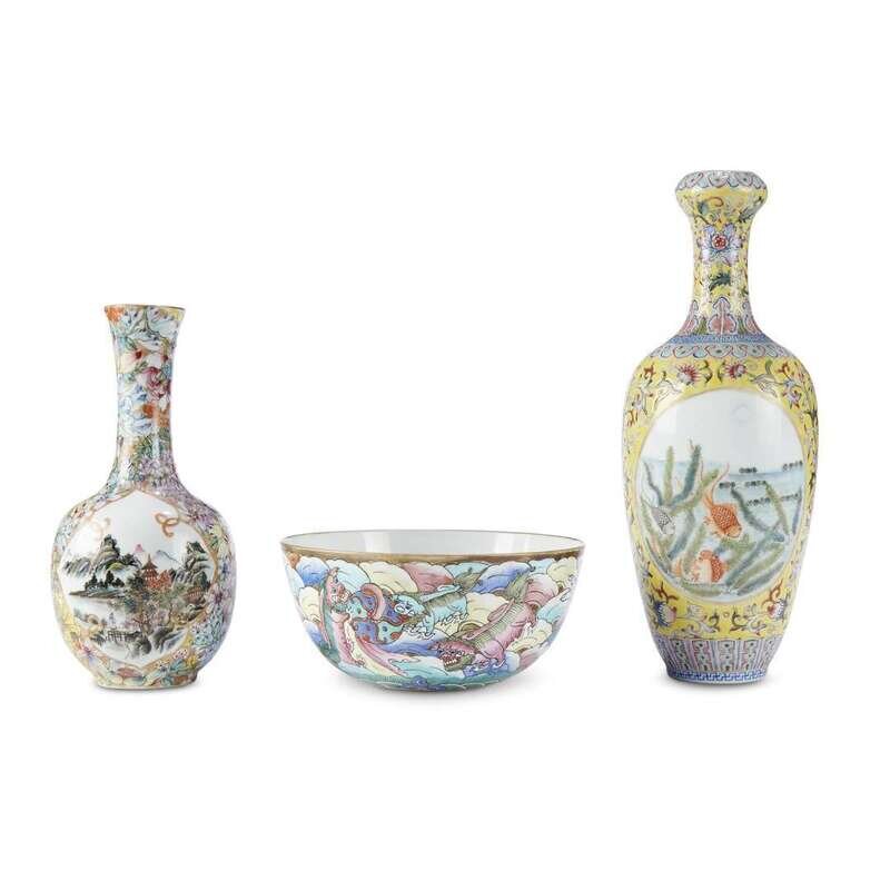 Comprising a "Fu-dog" bowl, underside with seal mark; yellow ground vase with fish reserves, underside with apocryphal Qianlong mark; "Millefleurs" vase with landscape reserves, underside with apocryphal Qianlong mark.