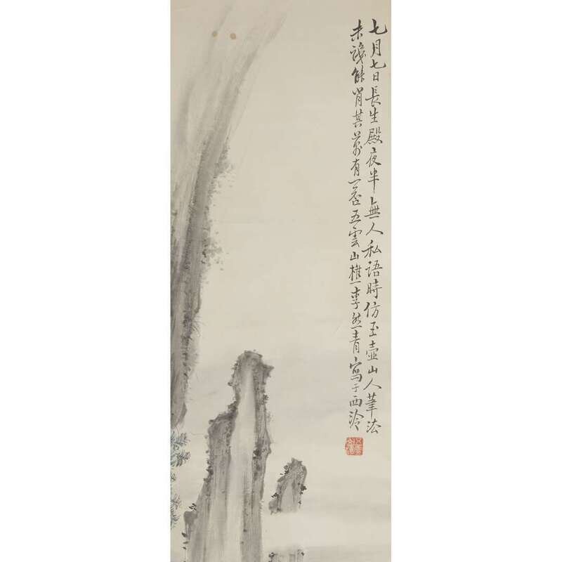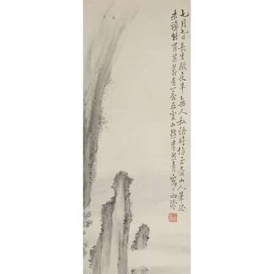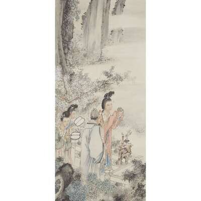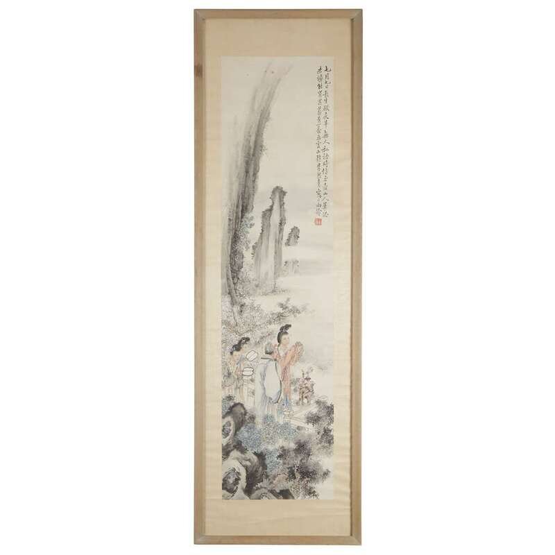 A MORNING OFFERING Ink and color on paper, inscribed and with one seal upper right, mounted on brocade, framed and glazed.