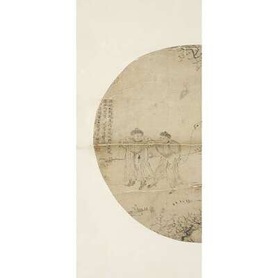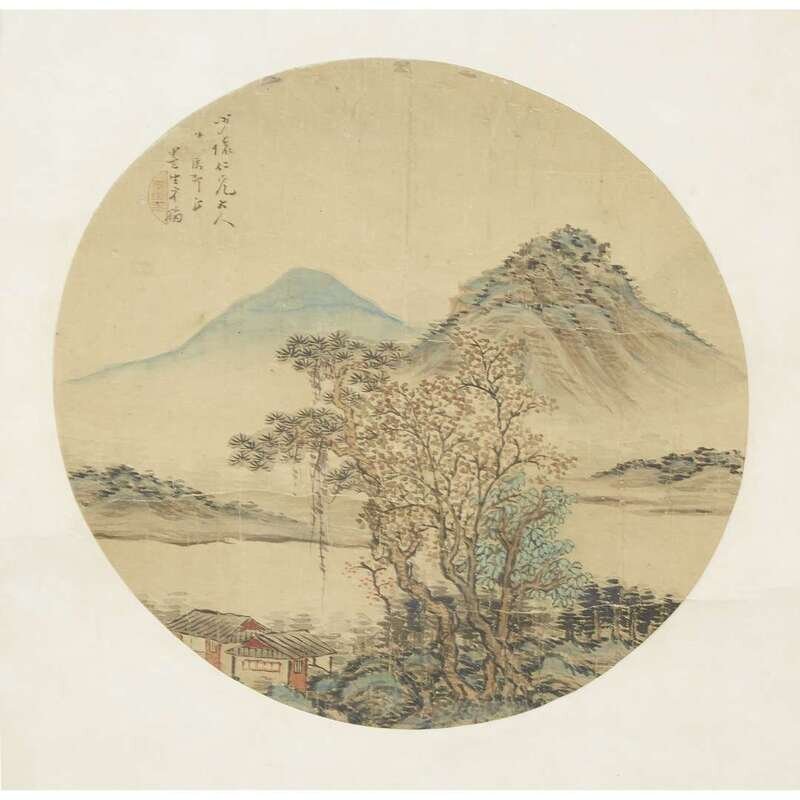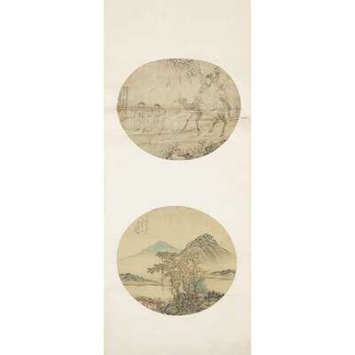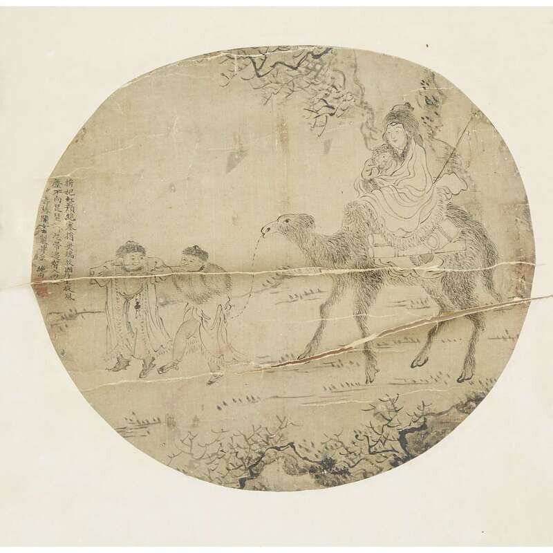 TWO CIRCULAR FAN PAINTINGS Ink and color on silk, one depicting a barbarian mother and child on camel with two attendants, inscribed and with two seals to left side; the second a river landscape, inscribed and with one seal to upper left, mounted as a hanging scroll.