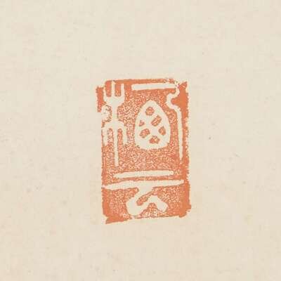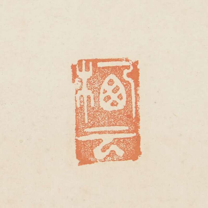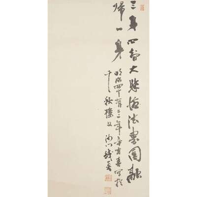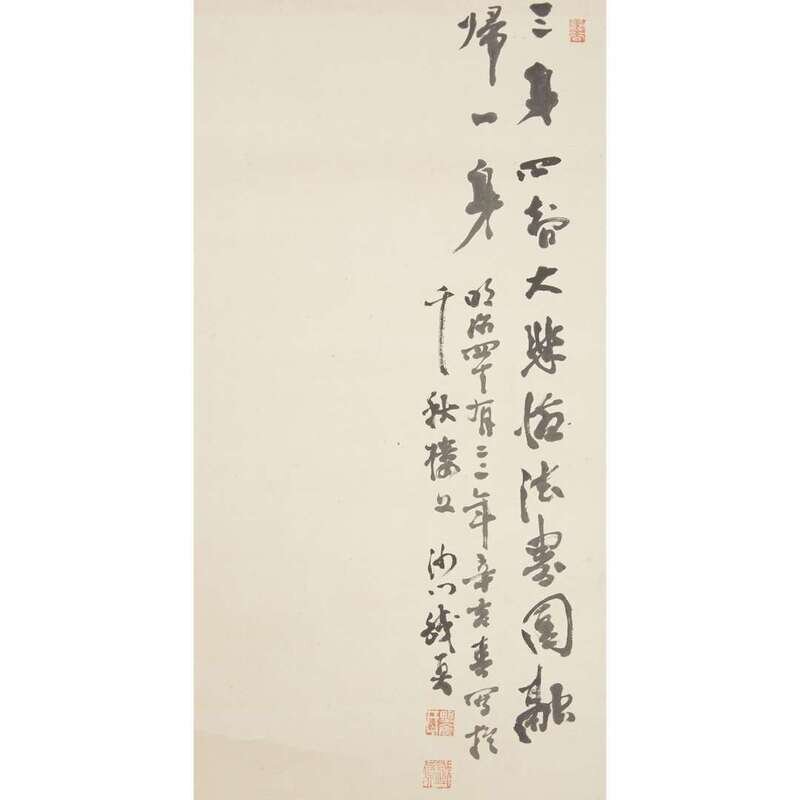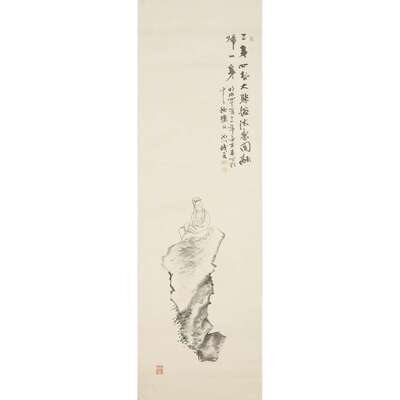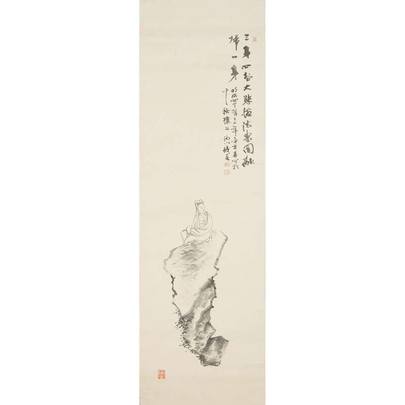 KANNON ON ROCK Ink and slight color on paper, inscribed at upper right with four seals at upper right and lower left, mounted as a hanging scroll.