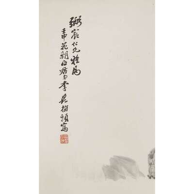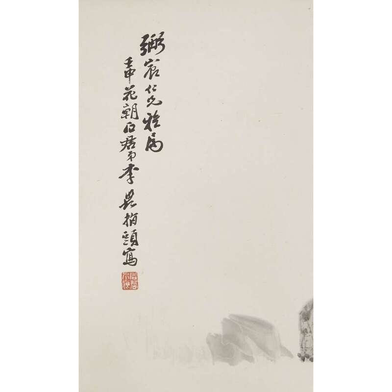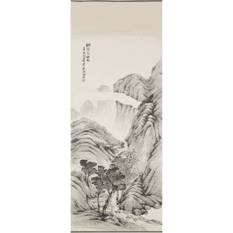TRAVELLERS IN A MOUNTAIN NIGHTSCAPE Ink on paper, inscribed and dated and with one seal to upper right, mounted as a hanging scroll. NOTE: According to the inscription, this work was painted by finger.