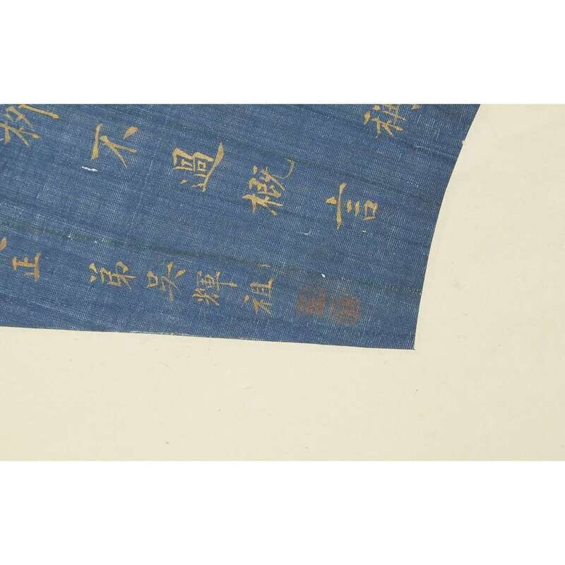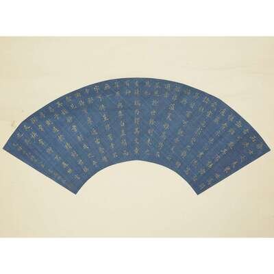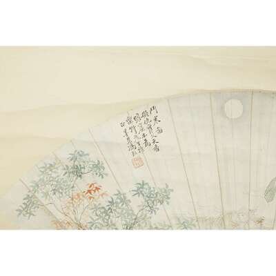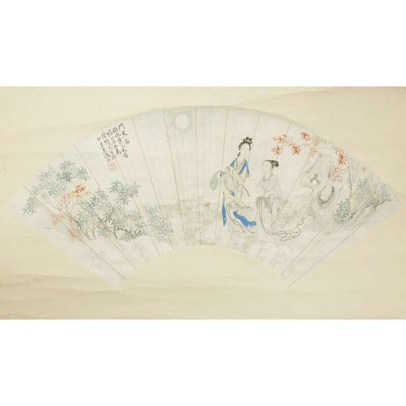 TWO FAN PAINTINGS, GOLD CALLIGRAPHY AND TWO FEMALE IMMORTALS WITH RABBIT The first on blue silk, inscribed and with two seals to lower left, the second inscribed and with one seal upper left, mounted as a hanging scroll.