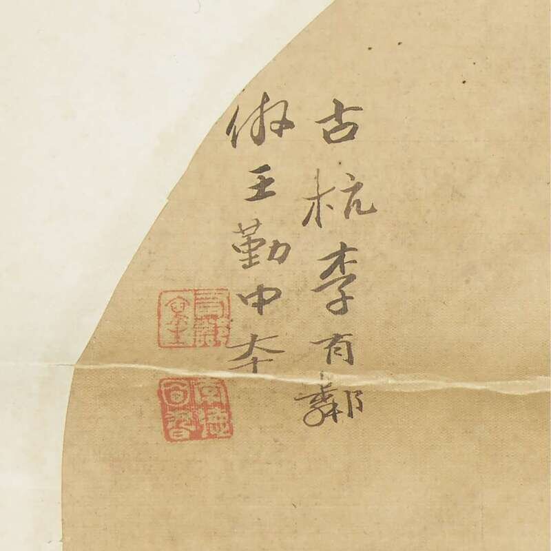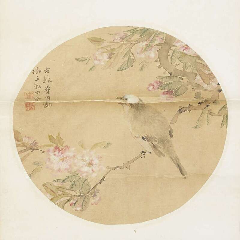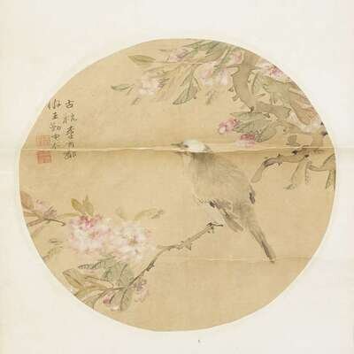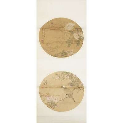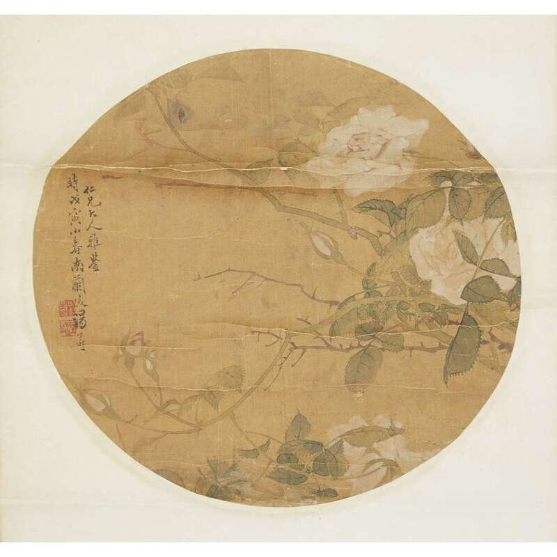 TWO FAN PAINTINGS, "ROSES" AND "BIRD ON PRUNUS" Ink and color on silk, each inscribed and with two seals to left side, mounted as a hanging scroll.
