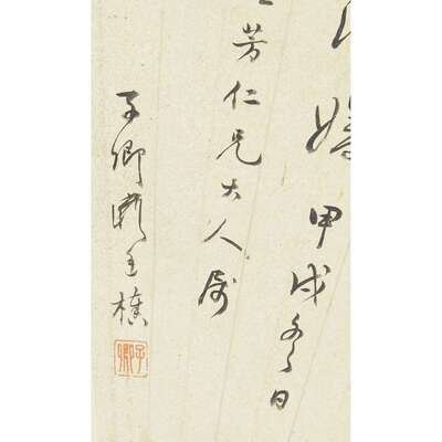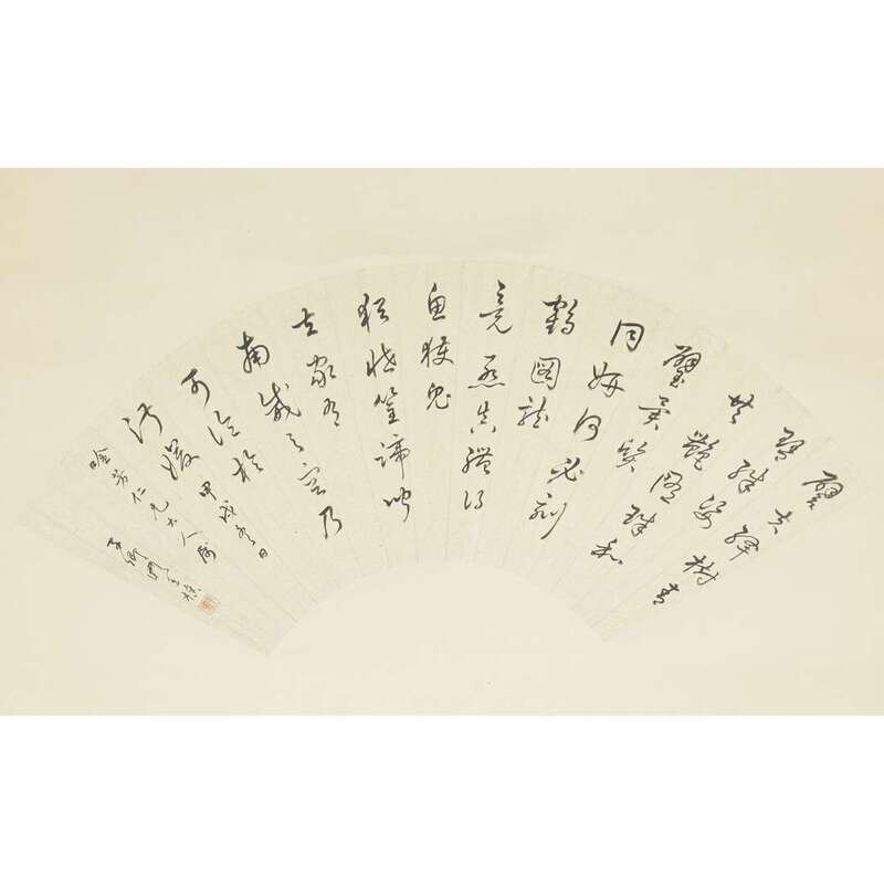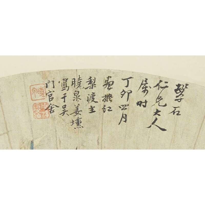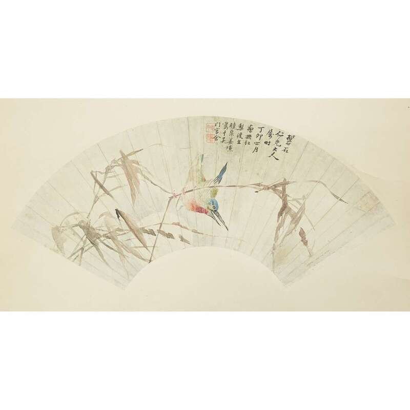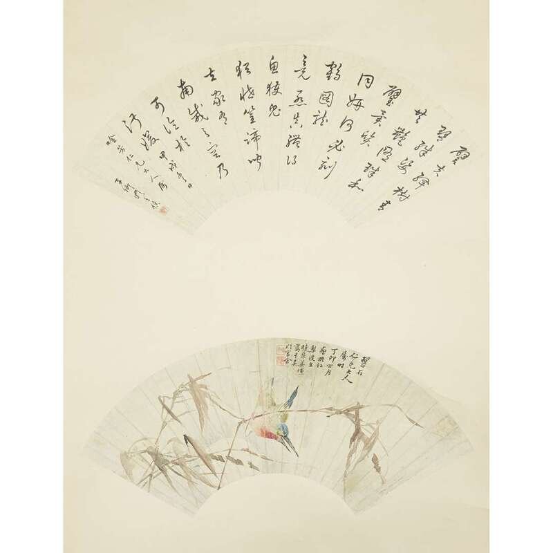 TWO FAN PAINTINGS: CALLIGRAPHY and BIRD ON BAMBOO Ink and color on gold-flecked paper, calligraphy inscribed "Zi Qing...Dong..." dated to the jiaxu year, and with one seal to lower left, second inscribed and with two seals to upper center, mounted as a hanging scroll.