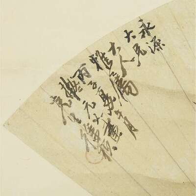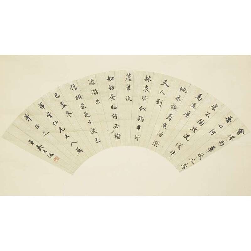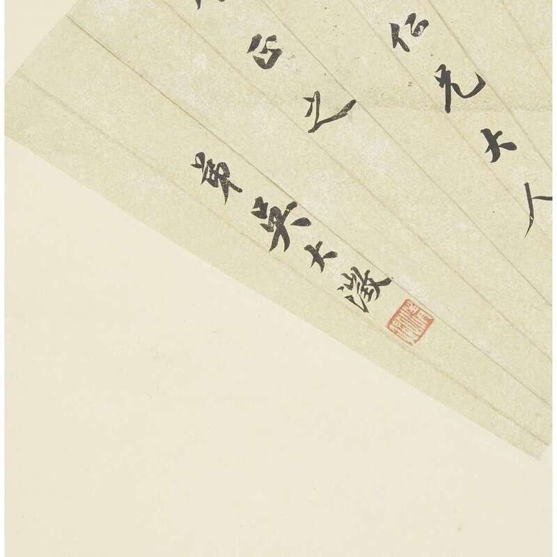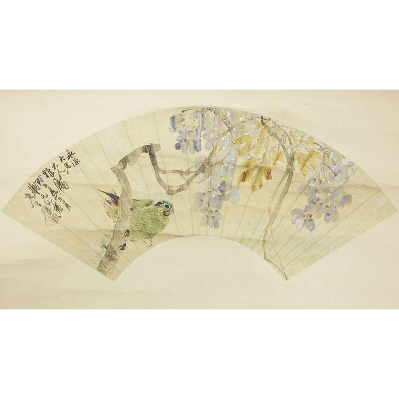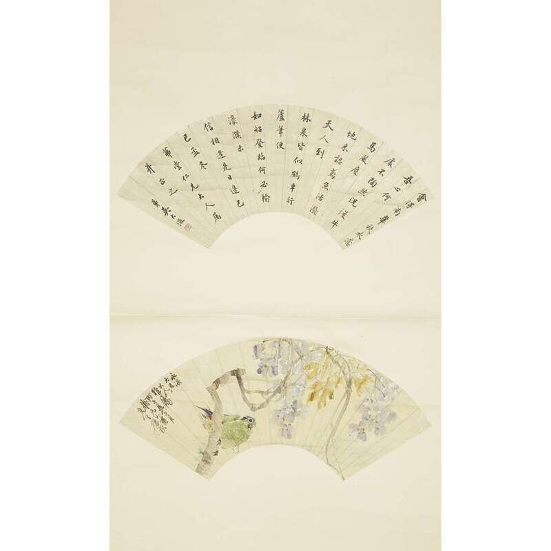 TWO FAN PAINTINGS: CALLIGRAPHY and BIRD WITH WISTERIA Ink and color on gold-flecked paper, both inscribed and with one seal to left side, the second dated to the bingzi year, mounted as a hanging scroll.