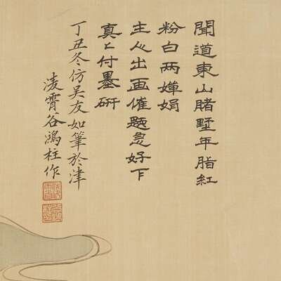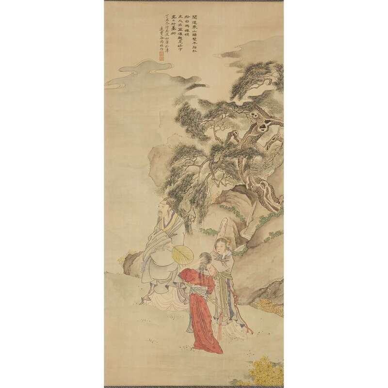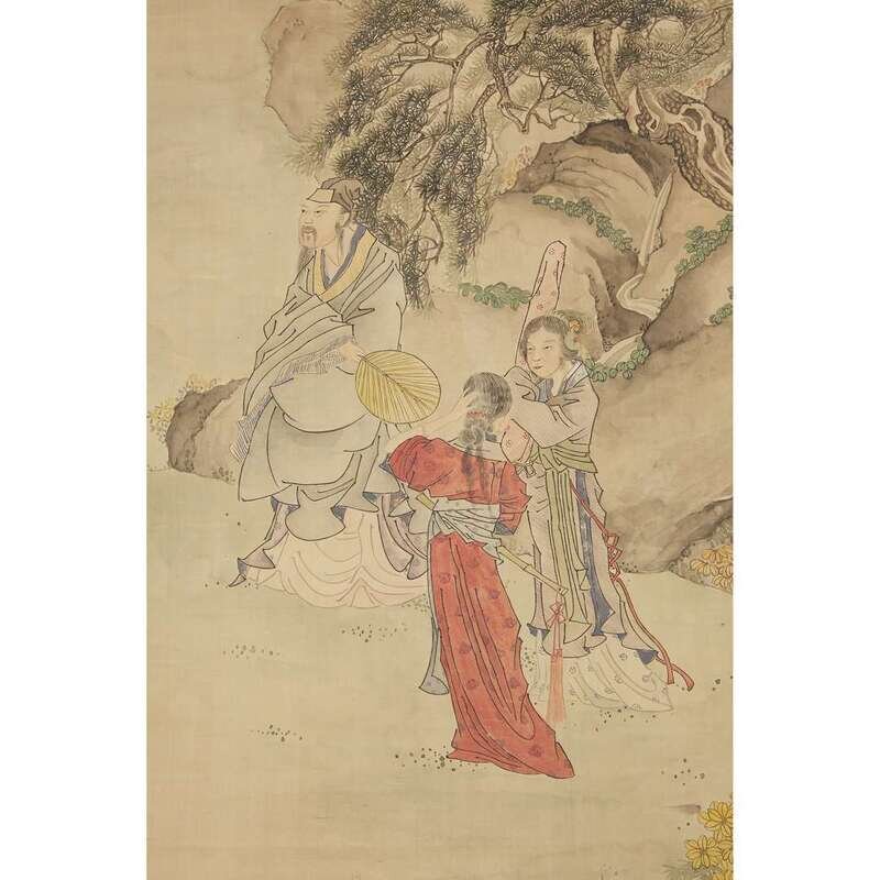 SAGE WITH TWO FEMALE ATTENDANTS Ink and color on silk, inscribed and with one seal upper left, mounted as a scroll.
