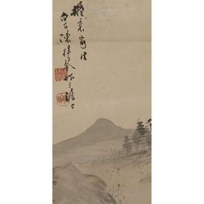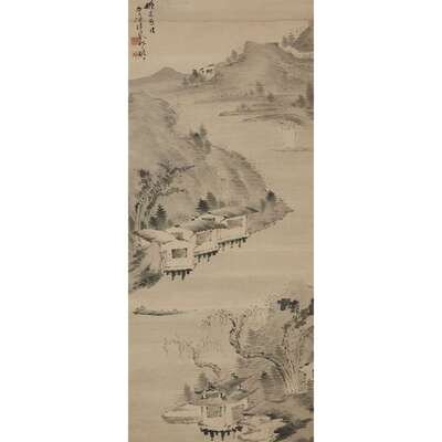 PAVILIONS ON A RIVER LANDSCAPE Ink on paper, inscribed and with two seals to upper left, mounted as a hanging scroll.