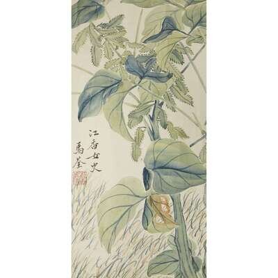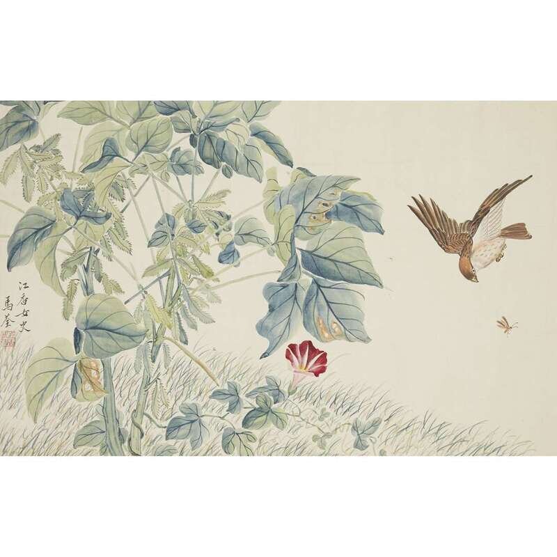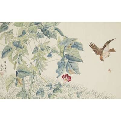 SPARROW AND HOLLYHOCK Ink and color on silk, inscribed and with one seal to center left, mounted sideways as a hanging scroll.