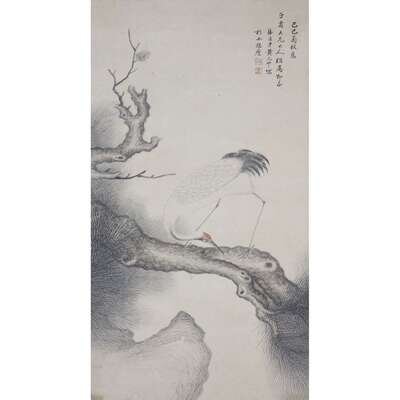 CRANE ON PINE Ink and color on paper, inscribed and with two seals to upper right, mounted as a hanging scroll.