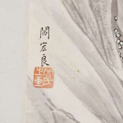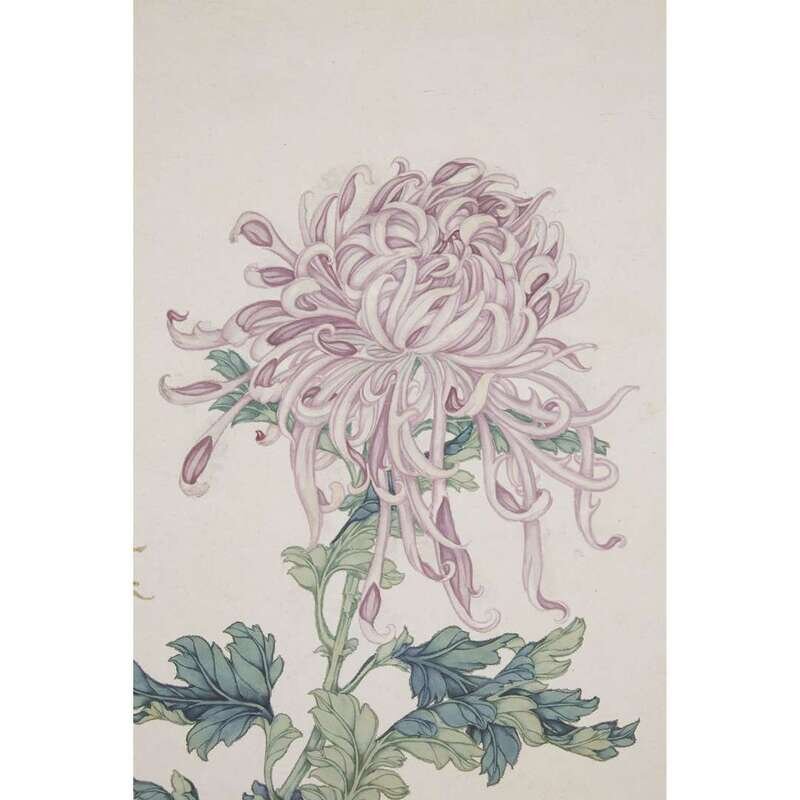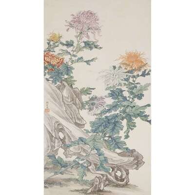 CHRYSANTHEMUMS Ink and color on paper, inscribed and with seal to center left, mounted as a hanging scroll.