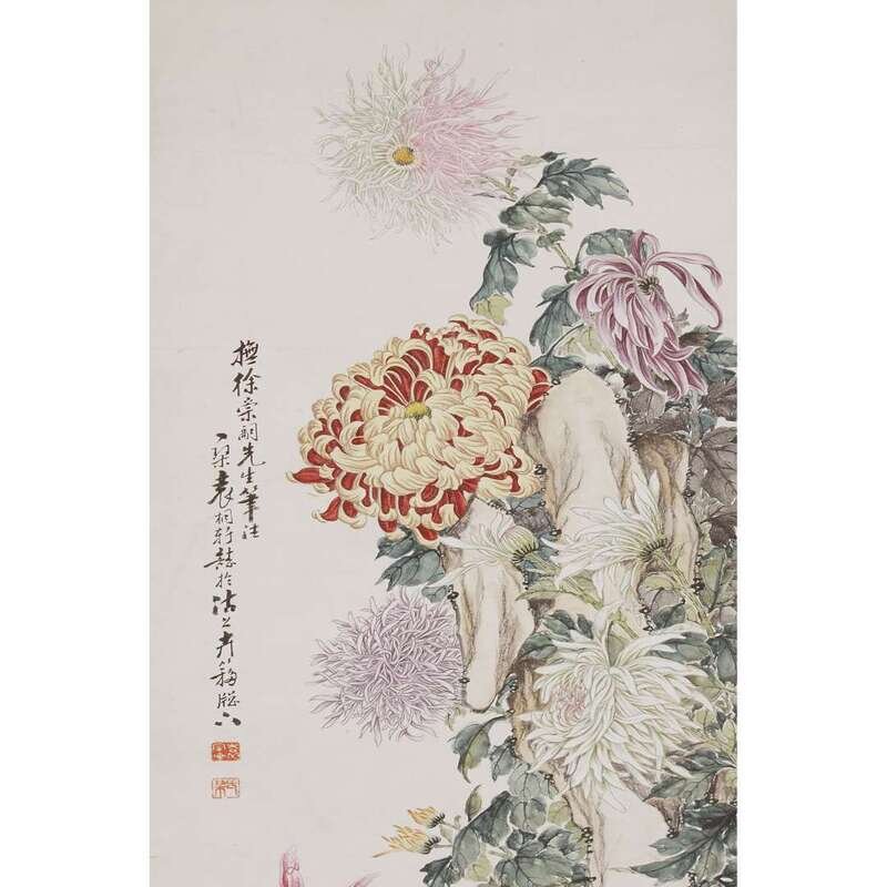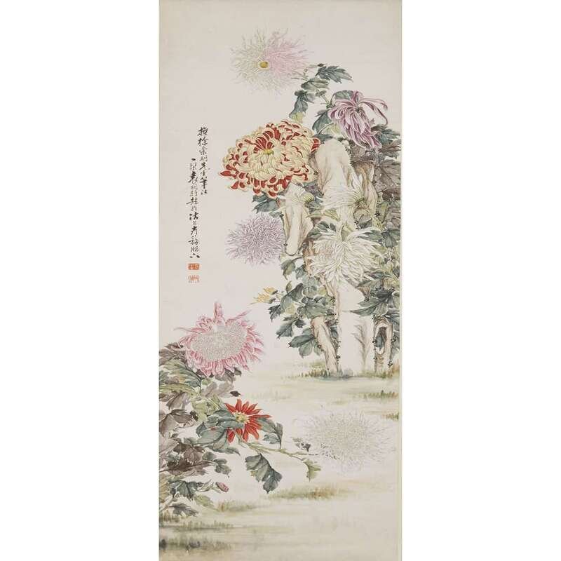 CHRYSANTHEMUMS Ink and color on mica-flecked paper, inscribed and with two seals to center left, mounted as a hanging scroll.