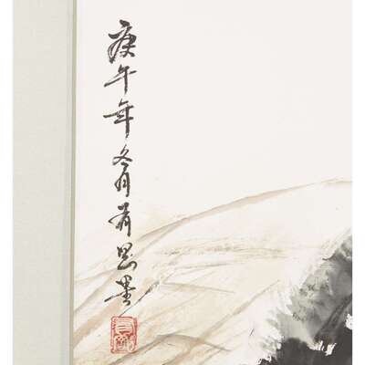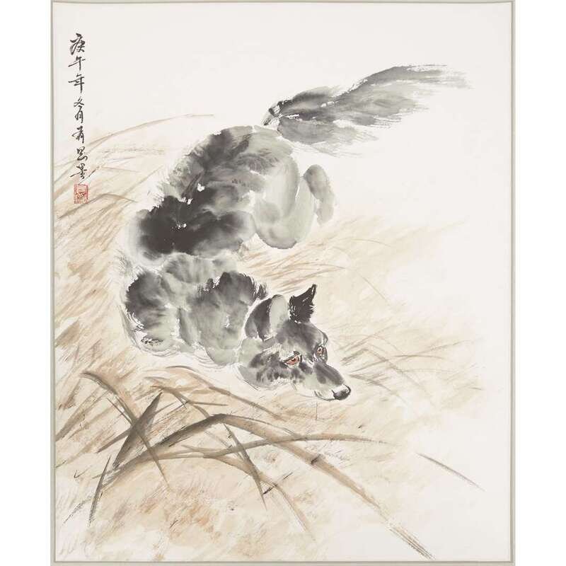 WOLF IN FIELD Ink and color on paper, inscribed and with one seal upper left, mounted as a hanging scroll.