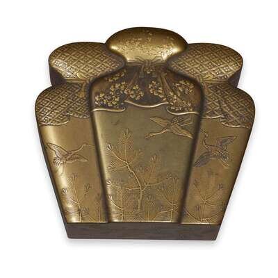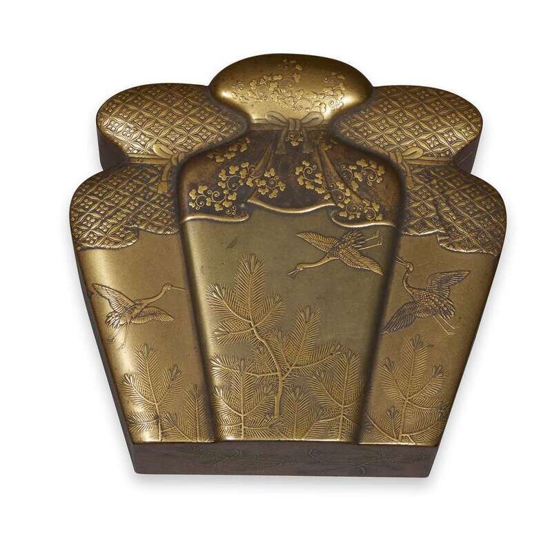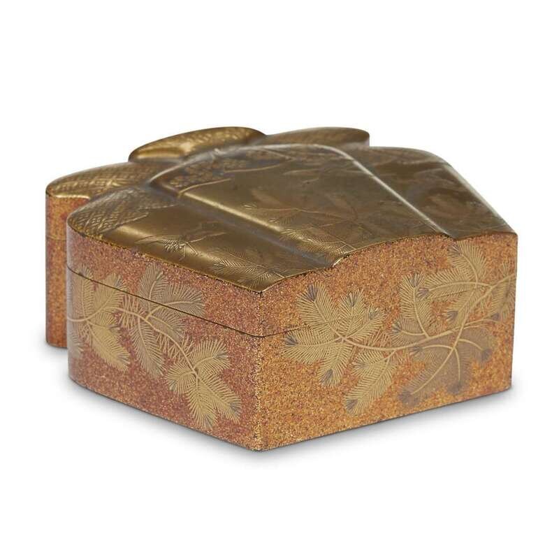 The brocade-wrapped jars decorated with cranes and pine, side of the box decorated with pine seedlings.