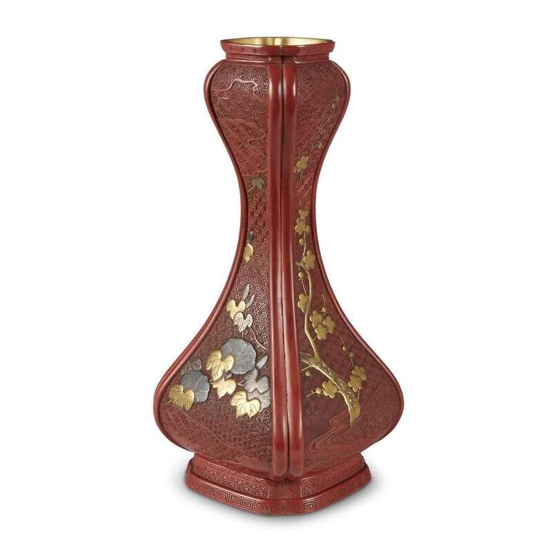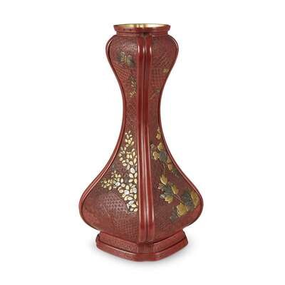 The lobed vase with panels depicting prunus, hollyhock and assorted foliage, in gold, silver and aogi-inlaid lacquer, against a variously diapered ground.