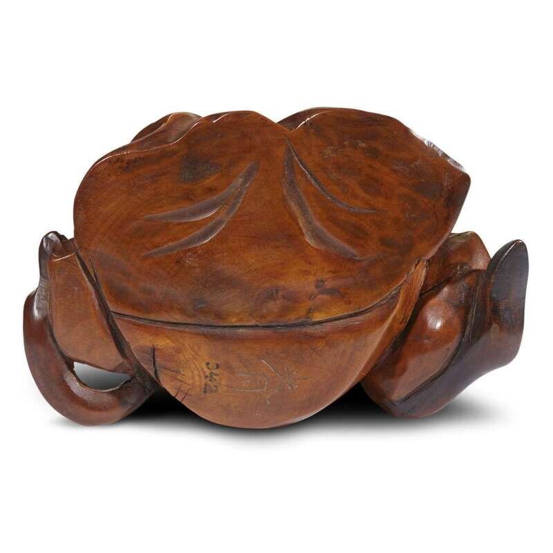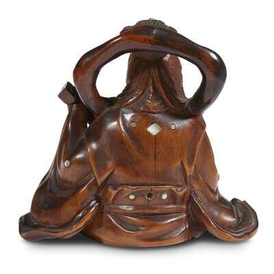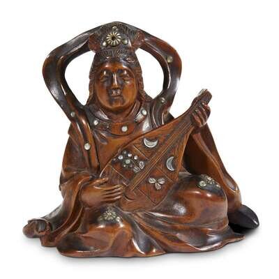 A Japanese carved and inlaid boxwood okimono depicting a seated bodhisattva with biwa, signed Komin meiji period, 19th century