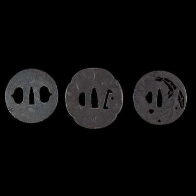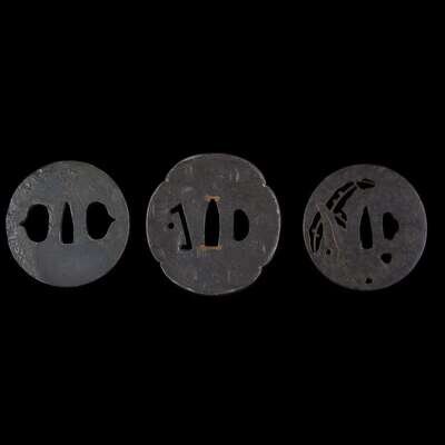 One tsuba with leaves, inscribed with "Masatoshi"; one with two peach-shaped aperatures inscribed "Kishu Ju Teimei", the third with various stamped characters.