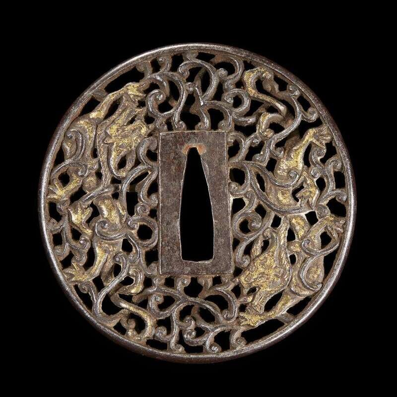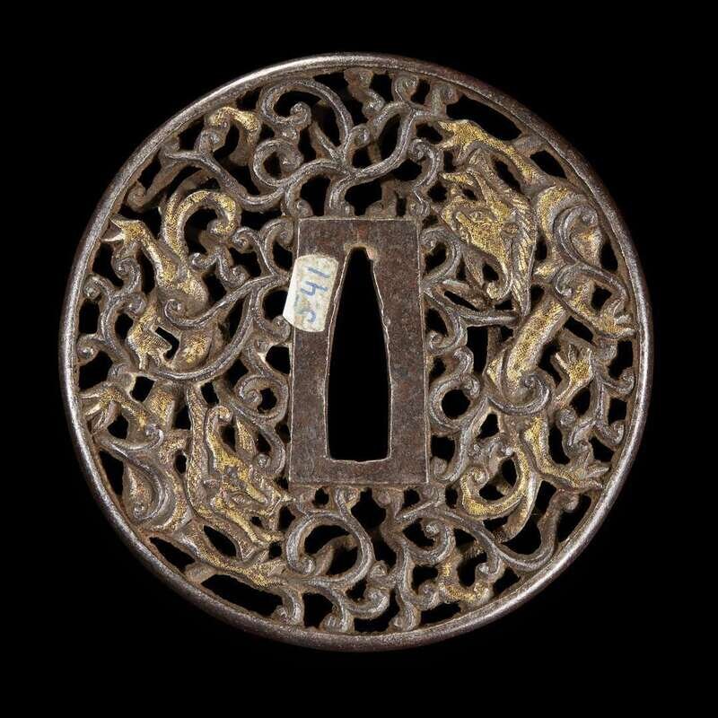A Japanese parcel-gilt pierced iron tsuba decorated with dragons among scrollwork edo period, 18th century or earlier