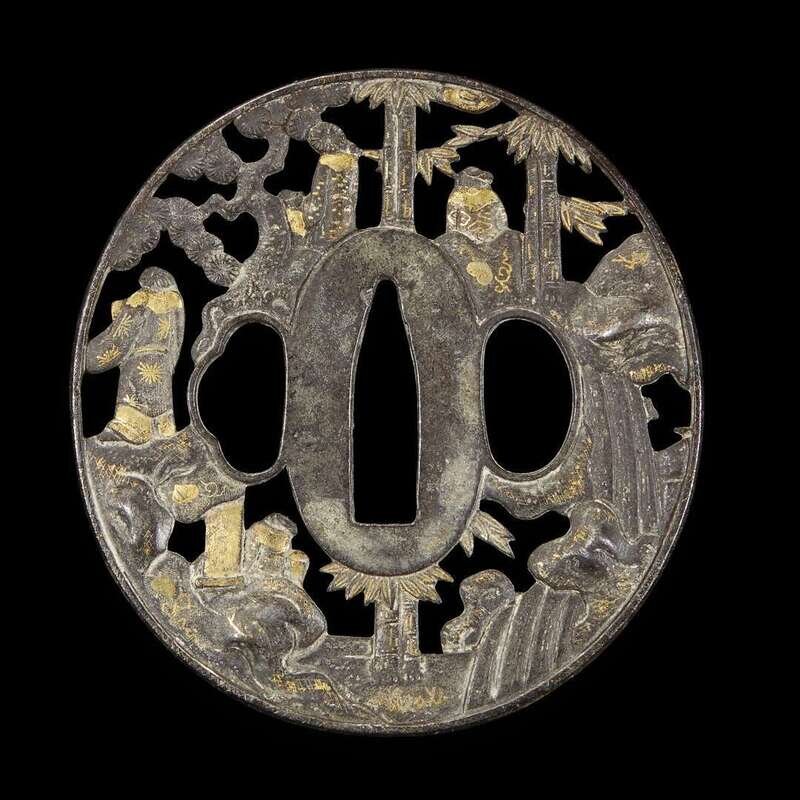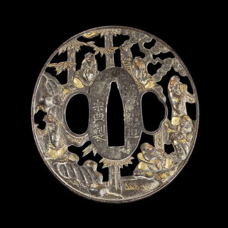 A Japanese mixed-metal-inlaid and pierced iron "Seven Sages of the Bamboo Grove" tsuba, signed Munenori edo period