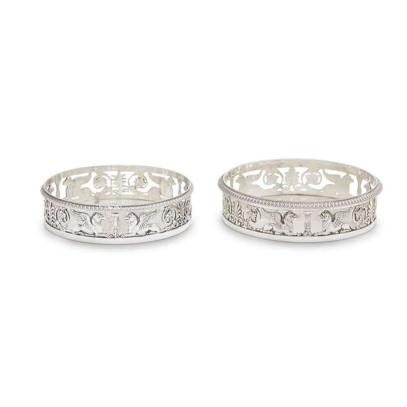 Both with beaded and leaftip-cast rim, the pierced sides with recumbent Sphinxes and foliate designs after Percier et Fontaine, the other of the same model and stamped to underside with early 19th century city mark of Munich, and the makers marks of Louis Wollenweber (apprenticed 1819). (2).