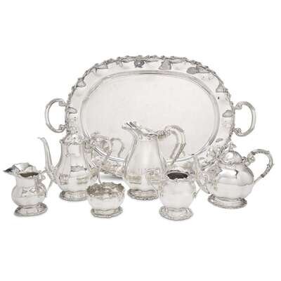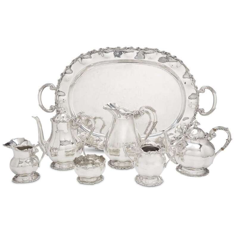 Comprising a teapot, coffeepot, pitcher, creamer, sugar, waste bowl, and tray. (7).