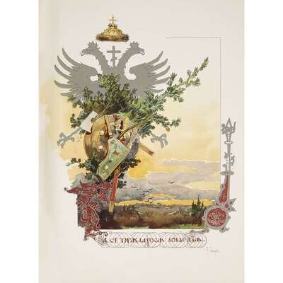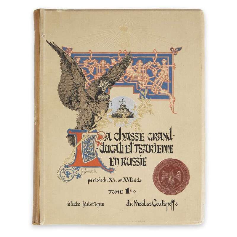 Grand Ducal and Royal Hunting in Russia, from the period of the 10th through 16th century Vol. I., of the French language edition, abundantly illustrated throughout with colored and plain illustrations in the text, some mounted, some hand-augmented and heightened with gold or silver, after Vasnetsov, Lebedev, Repin, Riabushkin, Roubaud, Samokish. Folio, moderately worn, joints and hinges intact with library stamps for California Western University Ryan Library, as well as a Torgsin export mark.