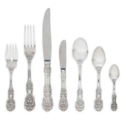 In the 'Francis I' pattern, comprising twelve each dinner knives, dinner forks, salad forks, butter knives, tablespoons, and demitasse spoons; twenty-four teaspoons; three serving spoons; a serving fork; a carving knife and fork; a ladle; a cracker spoon; and a melon spoon. (approx. 105).