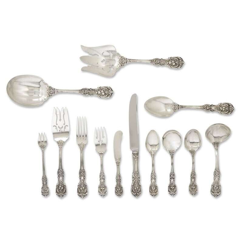 In the 'Francis I' pattern, comprising thirty teaspoons; eighteen each dinner knives, dinner forks, salad forks, and cream soup spoons; eleven cocktail forks; ten butter knives; two serving spoons; a pair of salad servers; and one each fish server, ladle, and small cracker spoon; some monogrammed "D." (approx. 130).