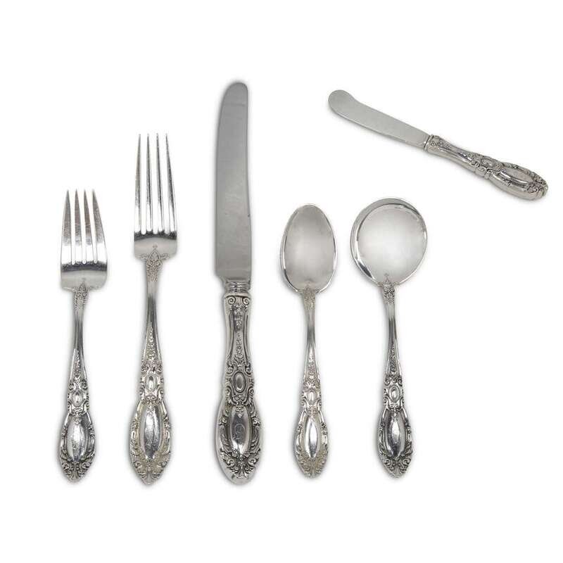 In the 'King Richard' pattern patented in 1932, comprising 32 teaspoons; 30 salad forks; eighteen each butter knives, cream soup spoons, luncheon forks, luncheon knives, and iced teaspoons; twelve seafood forks; four serving spoons; and one each serving fork, sauce ladle, tomato server, and cake slice. (approx. 172).