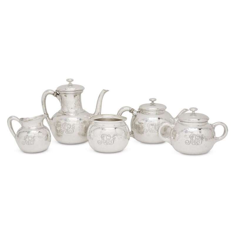 An American sterling silver hand-hammered five-piece tea and coffee service Whiting Mfg. Co., North Attleboro, MA, circa 1900