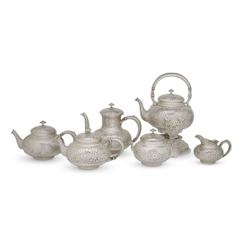 With allover repoussé decoration in the Persian style, comprising a coffeepot, two teapots, covered sugar, creamer, and kettle on stand. (6).