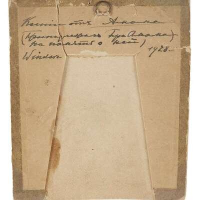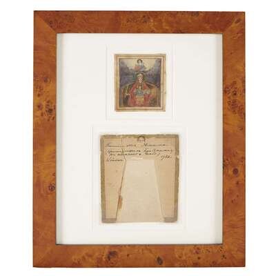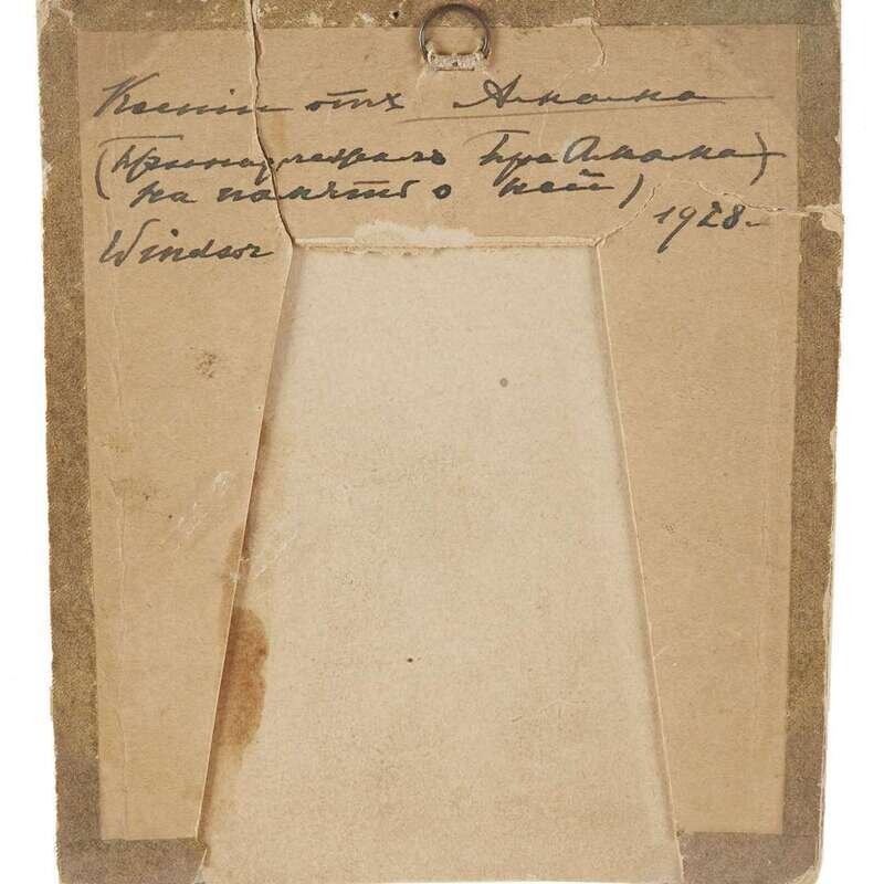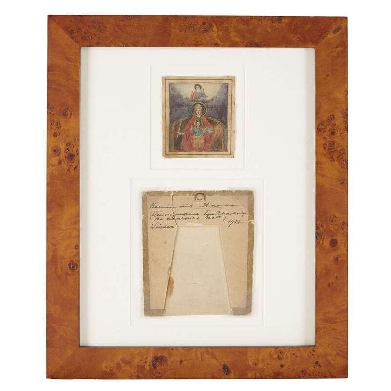 The hand painted icon of the Derzhavnaya ("She Who Reigns") Mother of God within a paper frame for presentation, bearing inscription in Russian: "To Ksenia from Amama [Grandmother]... presented (?) by her Amama in remembrance of her" and inscribed in English, "Windsor 1928" (now framed).
