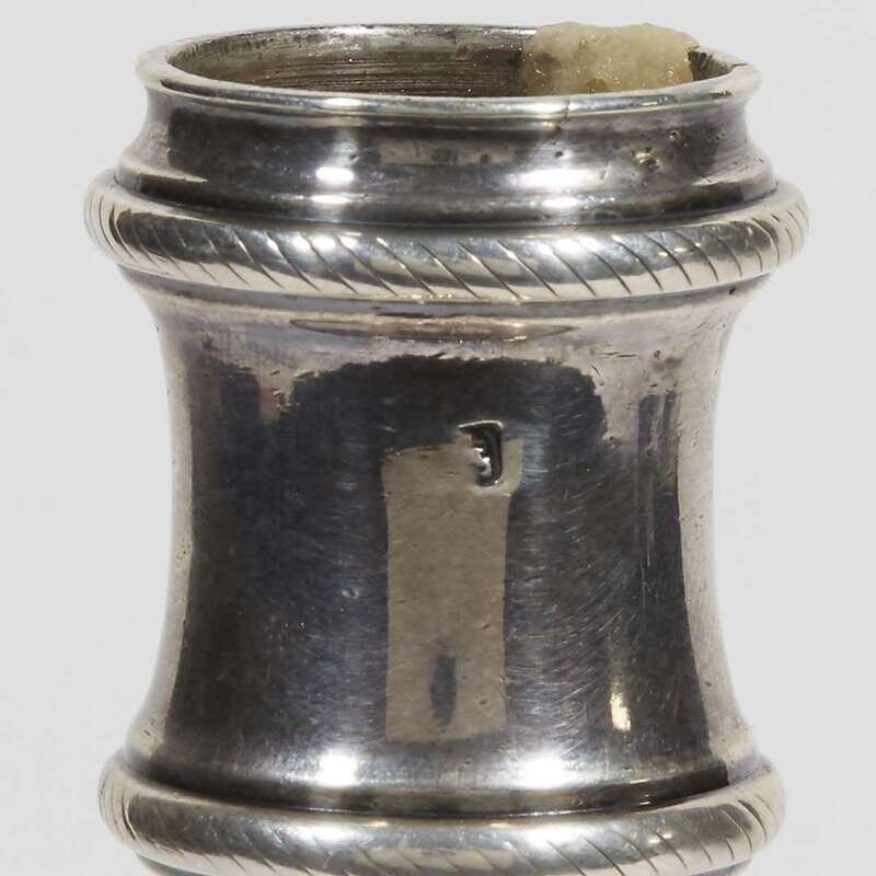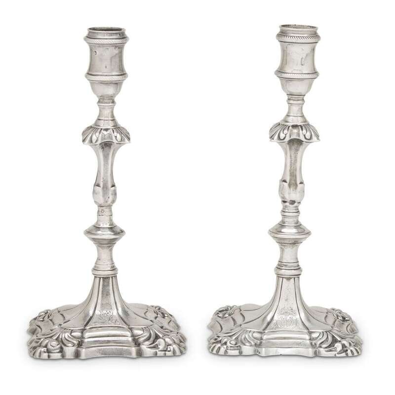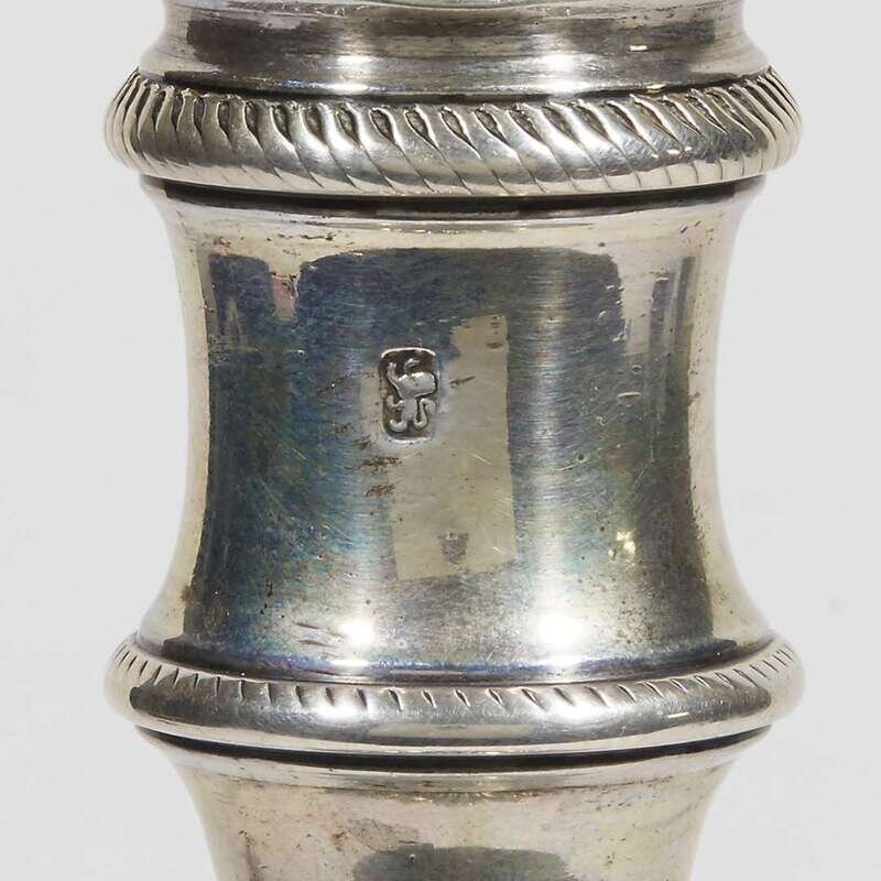 The cast baluster-form pillars on square shells, each marked to candle nozzles (bobeches missing), one with Brittania mark, the other with Brittania mark and indistinct mark "EC," the bases engraved with unknown arms; weighted. (2).