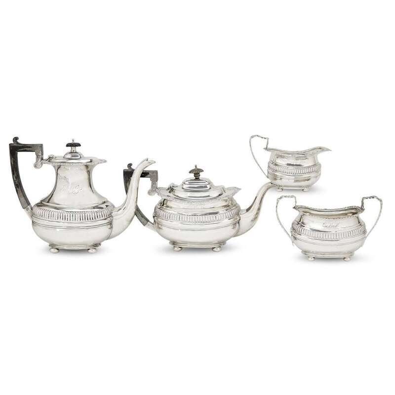 Comprising a coffee pot, teapot, open sugar, and creamer; each piece marked and monogrammed "EBP." (4).