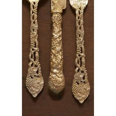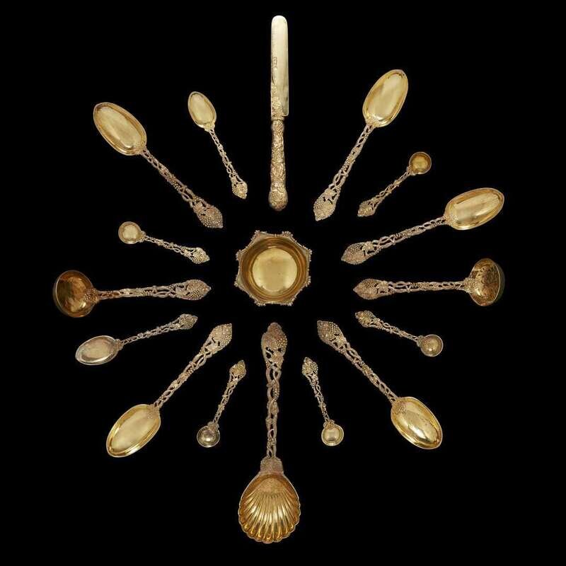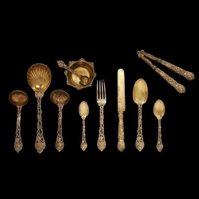 In the 'Open Vine' pattern, with date marks for 1890 and 1893, and with various maker's marks for Robert Roskell, Allan Roskell & John Mortimer Hunt; Alfred Benson & Arthur Henry Benson; and Alfred Benson & Henry Hugh Webb; comprising ten each dessert knives, ice cream spoons, and demitasse spoons; nine each dessert forks and table spoons; five salt spoons; three open salts; a pair of sugar tongs; and one each nut cracker, ice cream scoop, sugar sifter, and sauce ladle. (61).