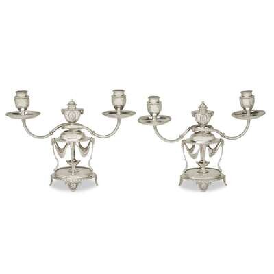A pair of Edward VII sterling silver two-light candelabra in the Adamesque taste possibly George Fox, London, 1906
