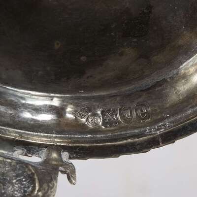 The urn-form nozzles with beaded drip-pans above scrolling interlaced arms centering a classical covered urn raised on an open table-form mount with rams' headed cabriole legs above a conforming oval base with garland and swag feet. (2).