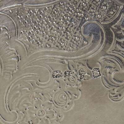 With shaped and moulded edge cast with shells, allover engraved with diapered and imbricated reserves centering a vacant cartouche; marked to underside.