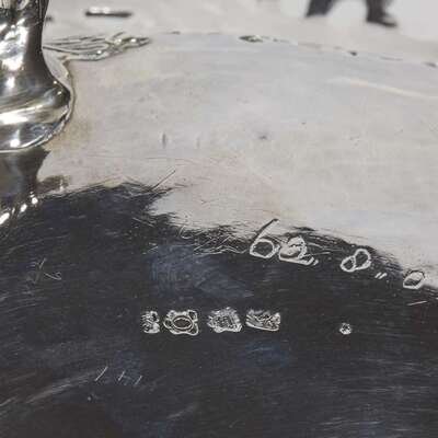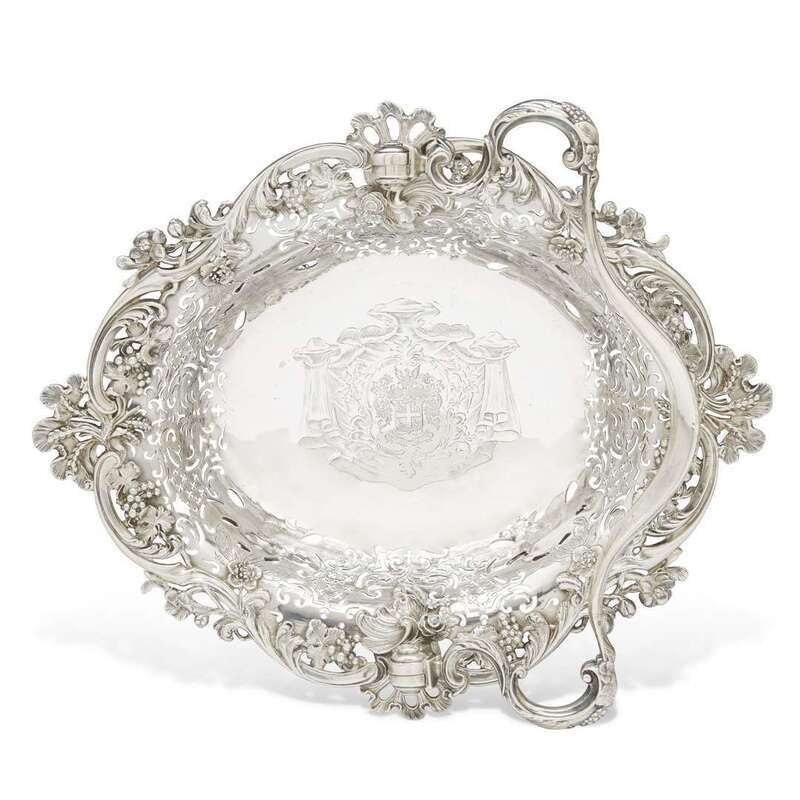 With yoke-form scrolled handle and heavily modeled pierced foliate rim decorated with wheat chaffs, grape vines, and roses, the body pierced with arabesques and diapered pattern and centering a finely engraved crest with arms of the Baronet of Webb; raised on volute legs headed by pierced rocailles; marked to underside and incised with scratched weight.