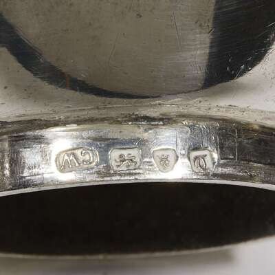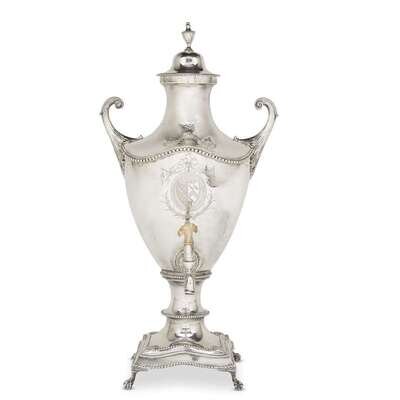 Of typical Neoclassical form, the bell-form cover with beaded urn finial and mounted to shoulders with foliate scrolled handles, the body further beaded at edges and finely engraved with a crest of a fox and further engraved above the spigot with an ribbon-tied and swagged impaled coat of arms, the whole raised on beaded shaped base on four ball-and-claw feet; marked to flange of lid and lower flange of body.