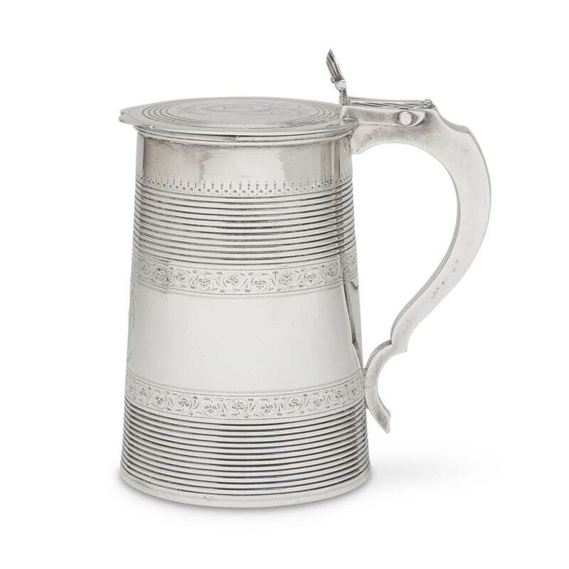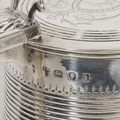 The body with two reeded bands flanked by bright cut foliate and egg-and-dart bands centering the arms of Chapman of Essex impaled with Bell of Middlesex, the flat lid similarly decorated; the interior with drink guard and marked to underside of lid; engraved to underside: "The Gift/of Jonathan Bell/to Abel and Rebecca Champman/1784."