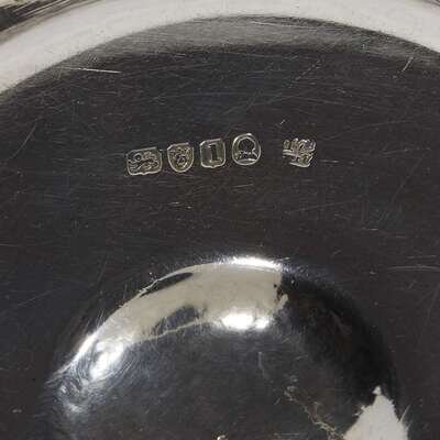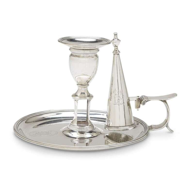 The chamber stick engraved with a coat of arms with bird and three stars and motto "Fide et Virtute," the bobeche and snuffer each engraved with a crest of a lion; marked to underside, bobeche, and snuffer. (2).