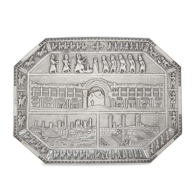A sterling silver repoussé tray depicting ancient scenes possibly Iranian, 20th century