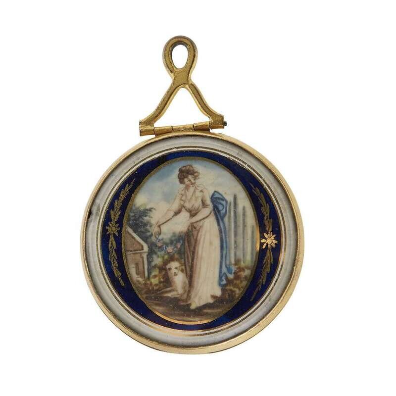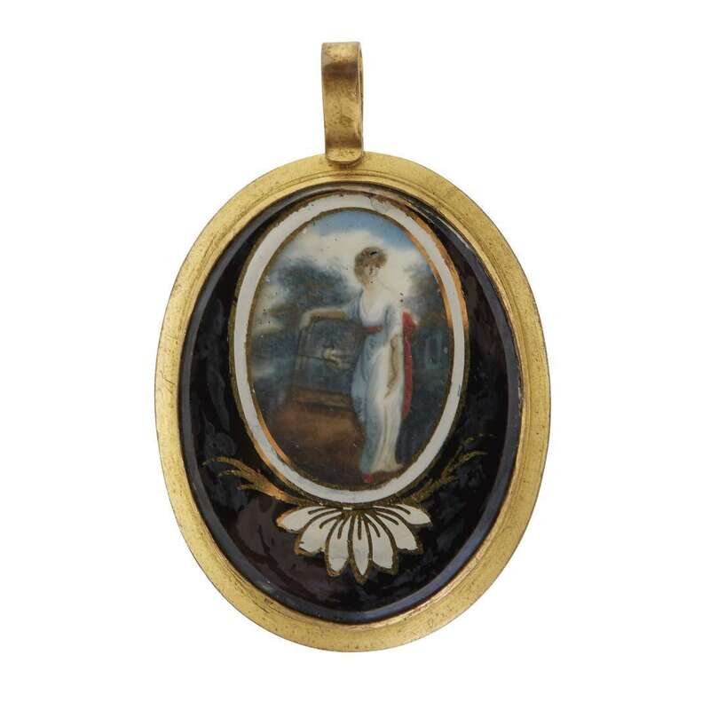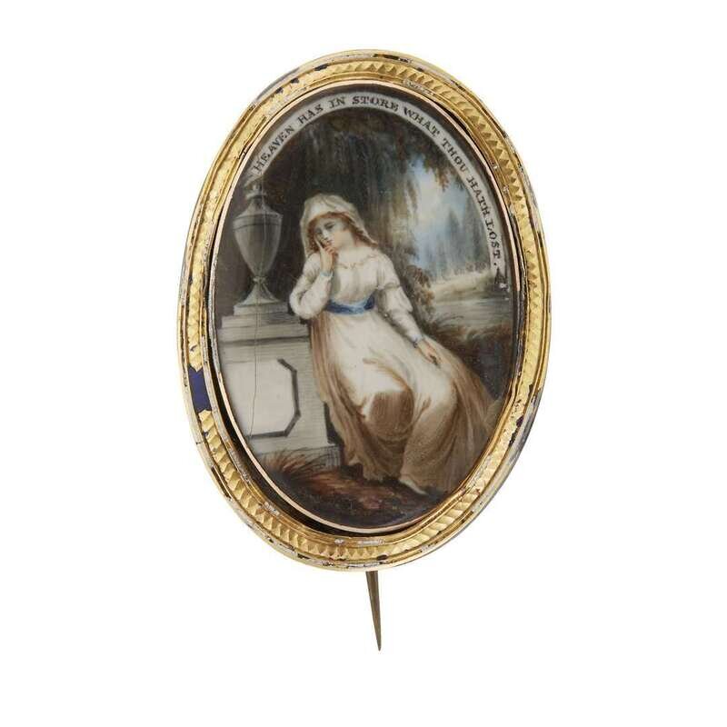 Of oval form, painted with female figure lamenting beside a covered urn on plinth beneath inscription, "HEAVEN HAS IN STORE WHAT THOU HATH LOST.," the reverse with space for hairwork and fitted with pin; together with two gold and enamel pendants, one circular with woman holding floral garland above recumbent sheep, and the second, oval with woman standing beside bird cage, all seemingly unmarked. (3).