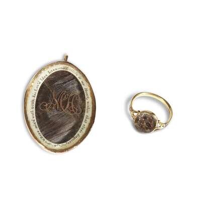 The ring with encased hairwork and inscribed, "James Home Obit 9 Octr. 1768"; the pendant of oval form with encased hairwork and ivory surround with inscription, "Where mix'd with God's, his Lov'd idea lies. Hide it my Heart, within that close disguise," and gilt monogram "NCH." (2).
