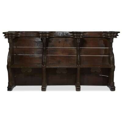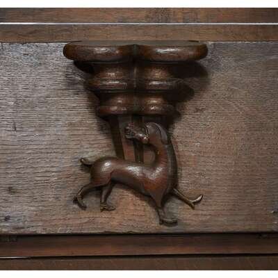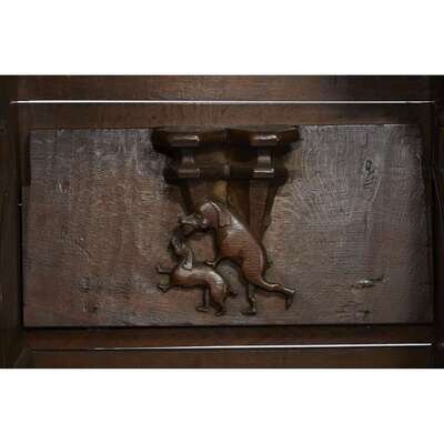 With paneled back separated by shaped late Gothic capitals above moulded dividers, the three seats with four ogee arches and central canopy above four hinged seats carved with fantastic animals.