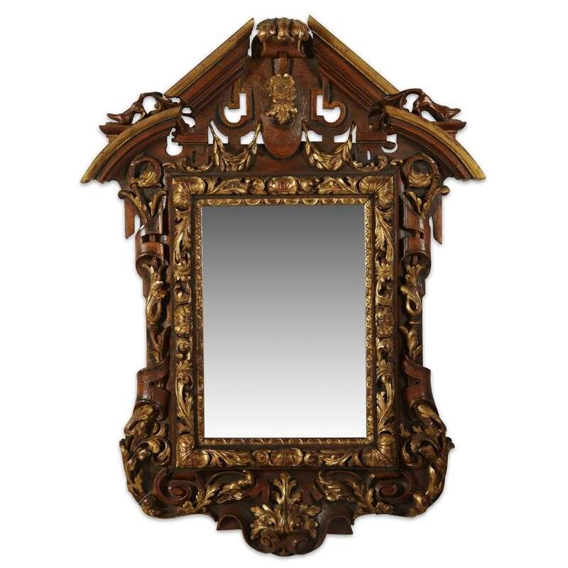 The rectangular mirror plate within a frame with double broken pediments above strapwork, garland and scrolling foliate carving highlighted with gilding.