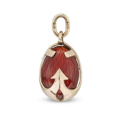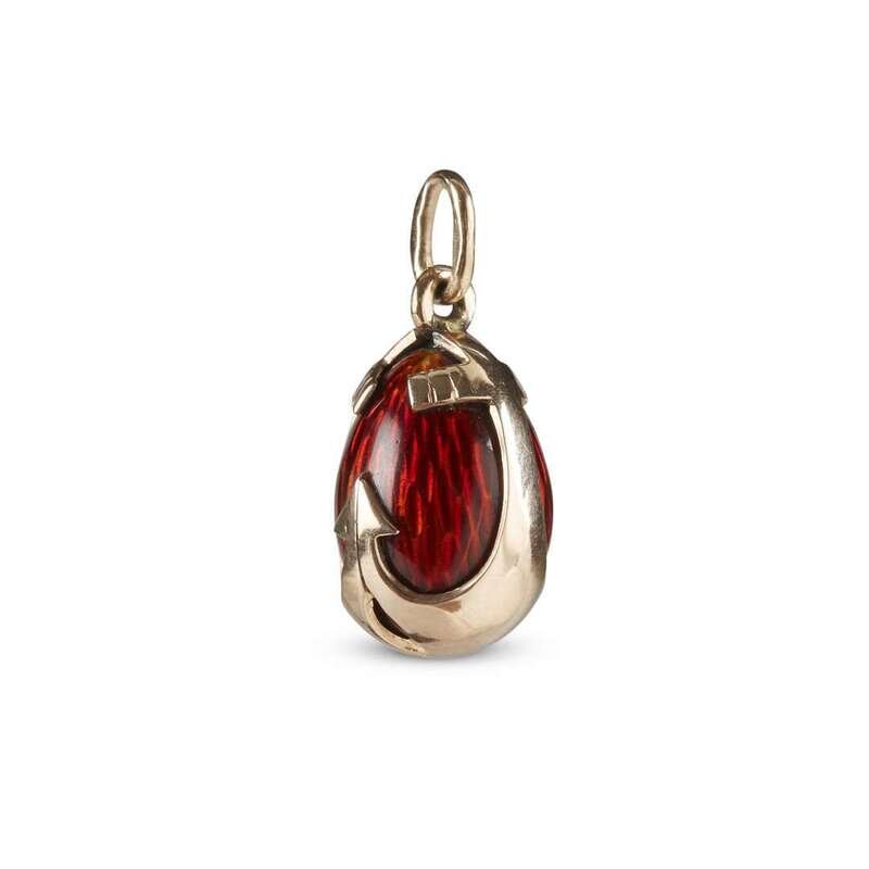 A Fabergé gold and strawberry red enamel miniature egg with anchors marked with cyrillic "KF" to bale and to suspension ring, circa 1900