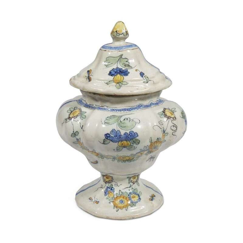 Of lobed baluster form with conforming lid, floral decorated in blue green and ochre.